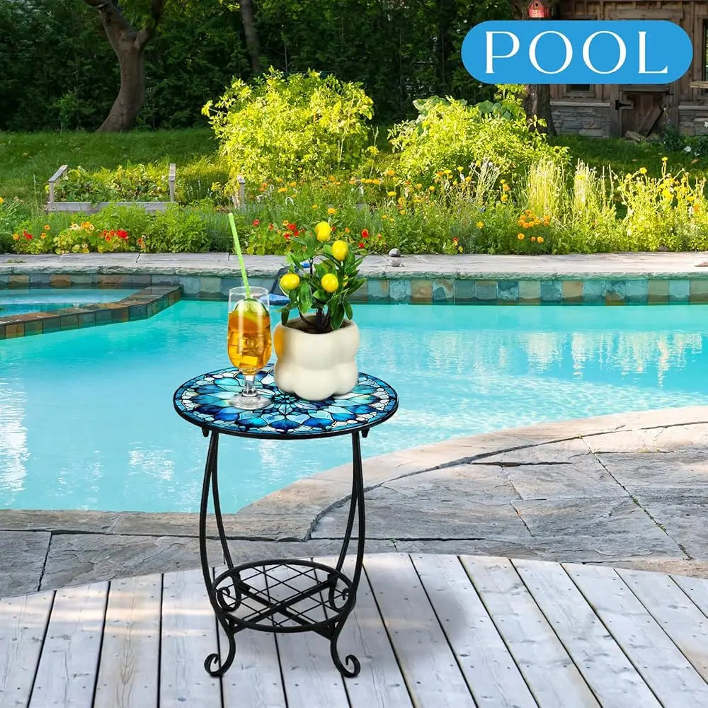 14"" Outdoor Side Table Round Small Mosaic Patio Accent Indoor End Plant Metal Coffee Tea Table For Yard Porch Garden Patio Living Room, Bedroom(Mandala Flower Style,14"")