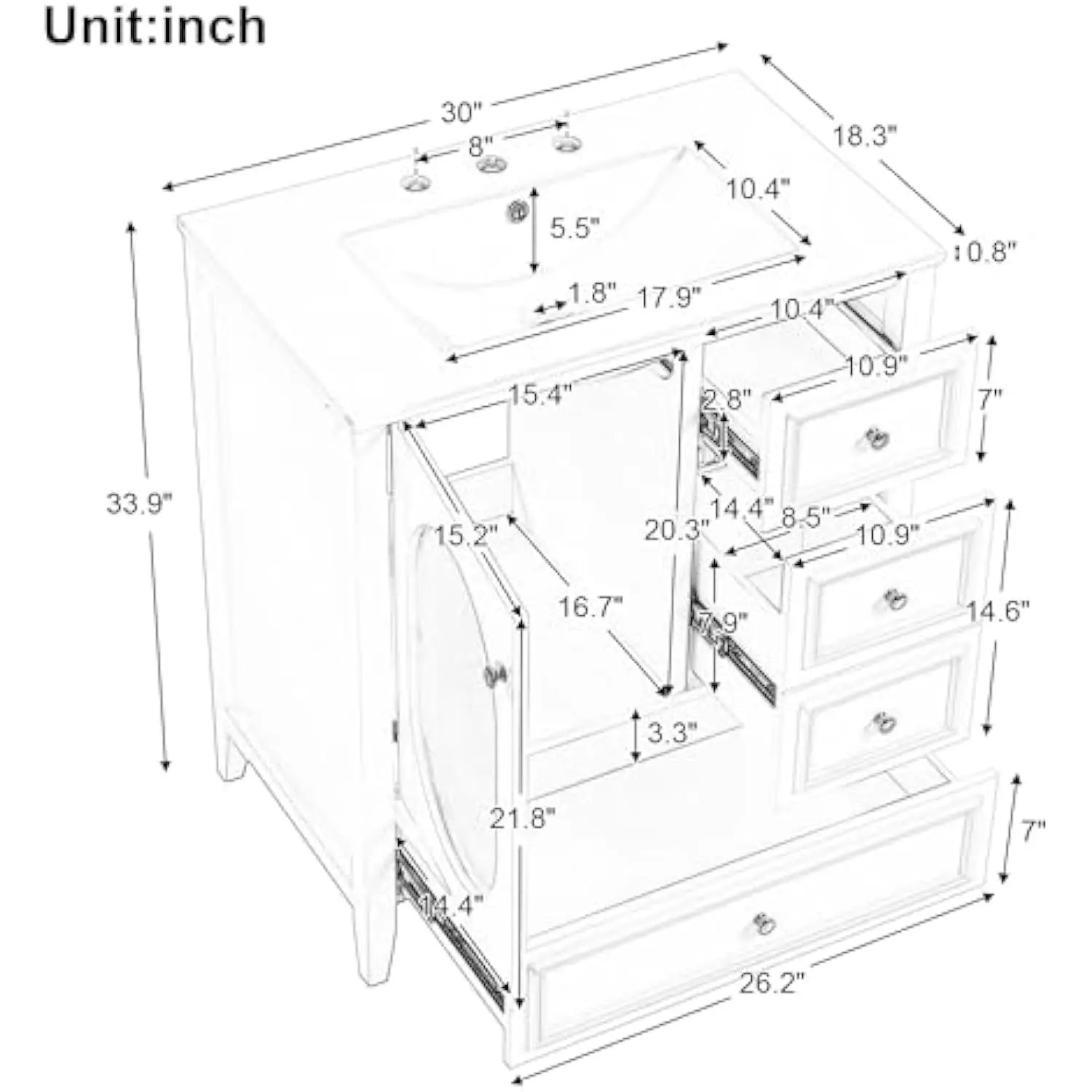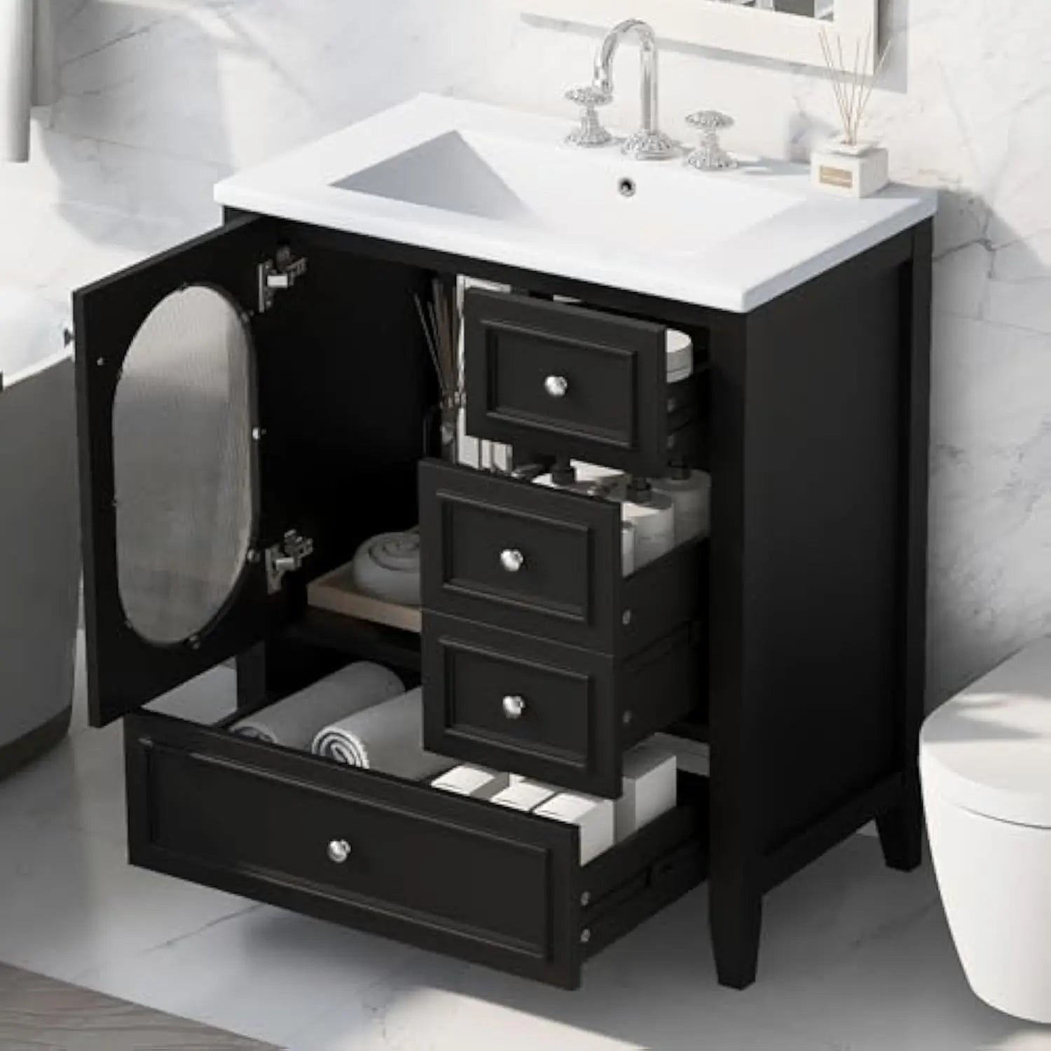 【Abundant Storage Options】Designed With The Humid Bathroom Environment In Mind, This Bathroom Sink With Cabinet 30 Inch Offers Ample Enclosed Storage Spaces. It Includes One Cabinet With A Door And Three Drawers With Smooth Slide Rails, Perfect For Organizing Soaps, Towels, Shampoos, Tissue Paper, And Other Essentials.