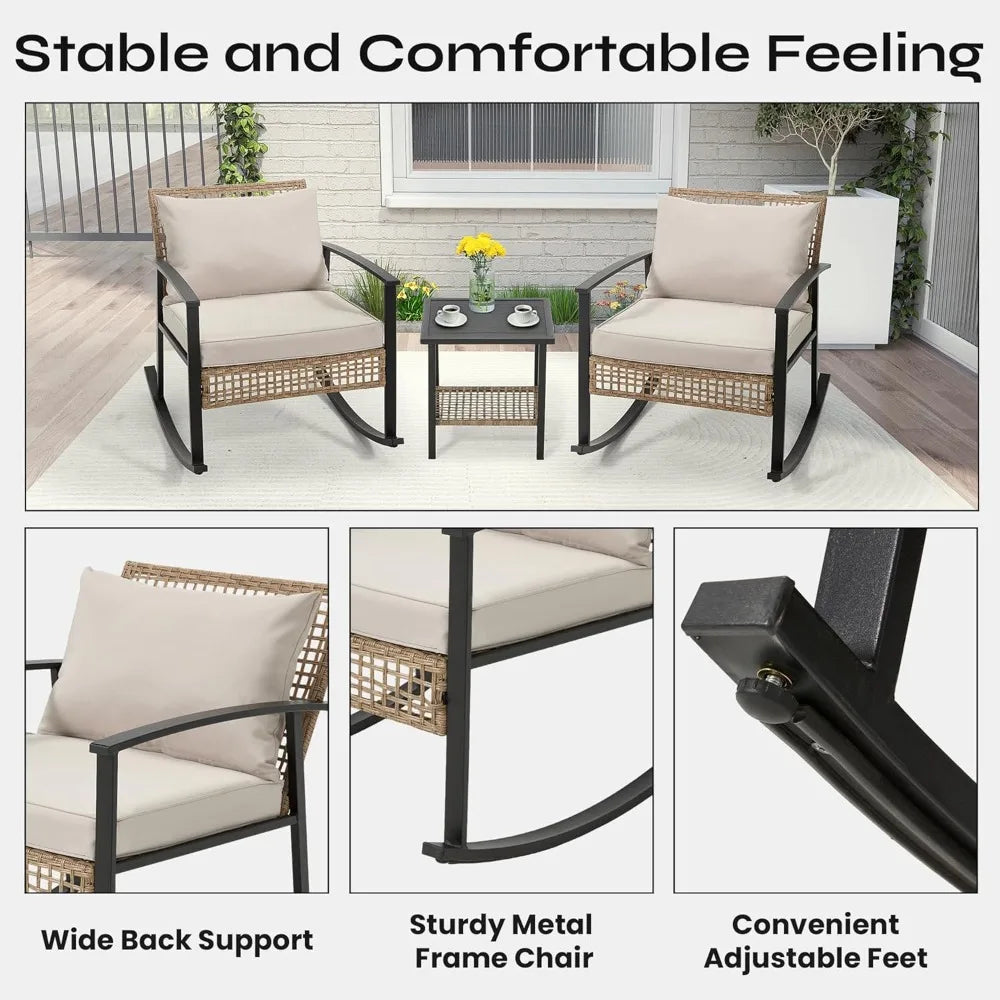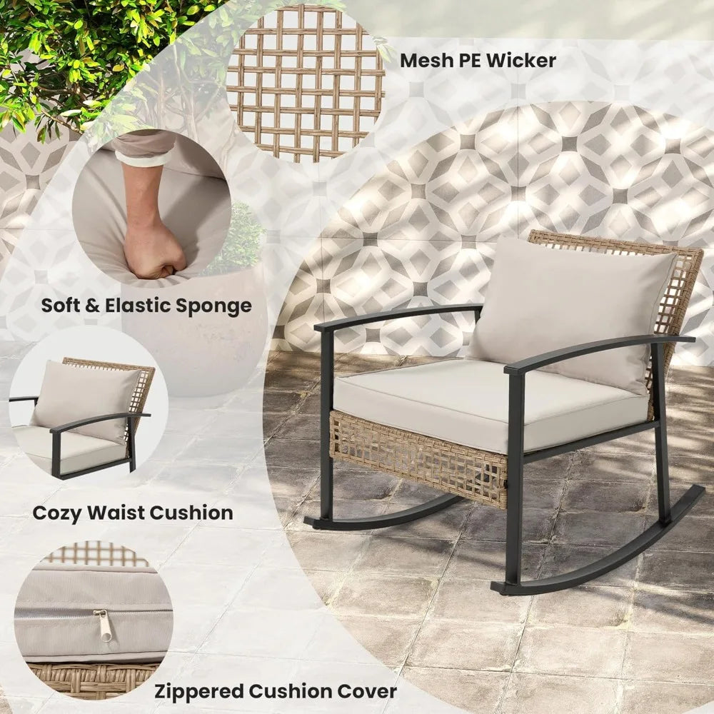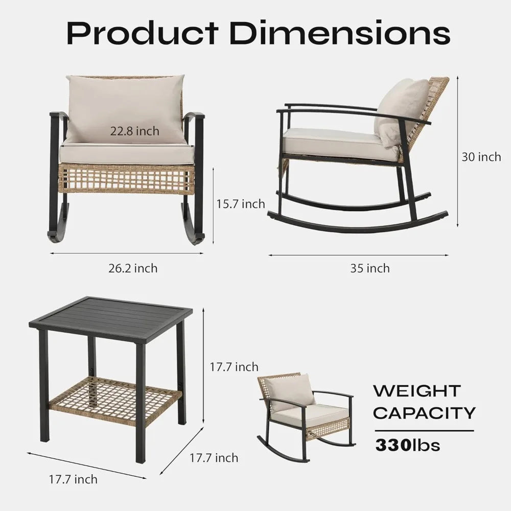 - Safe and Comfortable Rocking Design: The patio furniture chairs feature a swing design, providing a relaxed feeling. The anti-tipping knob and rubber strip at the bottom will ensure your safety and prevent you from falling due to excessive rocking. Maintain a smooth and soothing feeling outdoor rocking chairs set of 2 patio rocking chairs 3 piece patio set