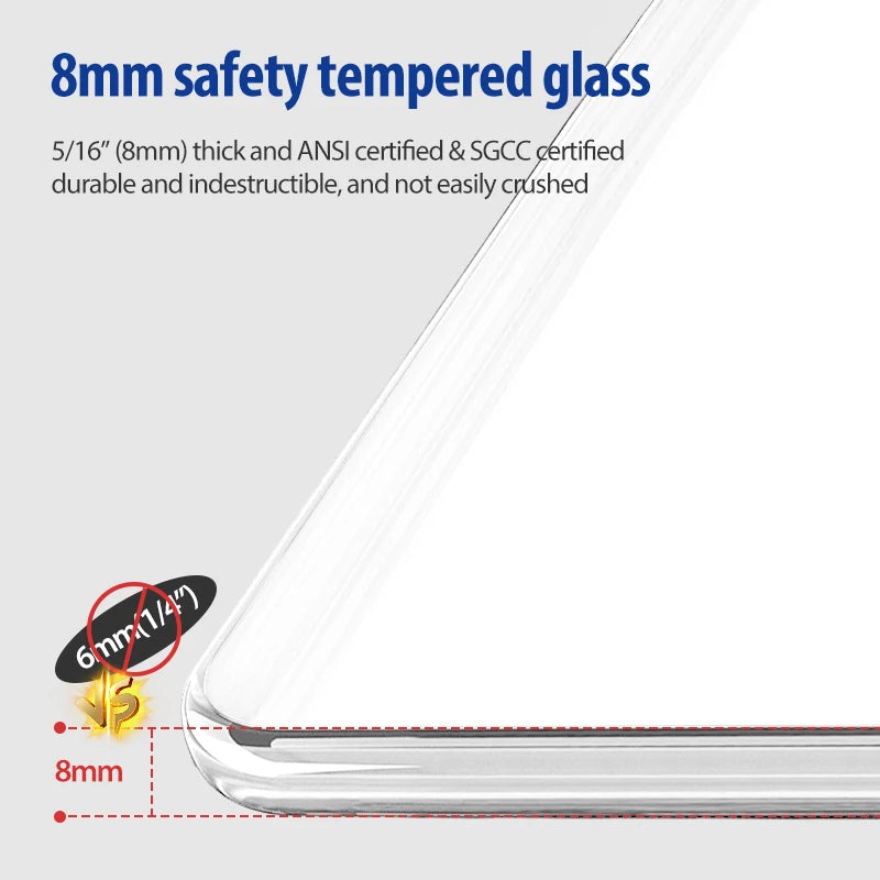 The shower screen for walk in is designed with safety SGCC/ANSI-certified 5/16 inches (8mm) thickened clear tempered glass, which not only creates a spacious and open feeling, but also effectively resists damage.