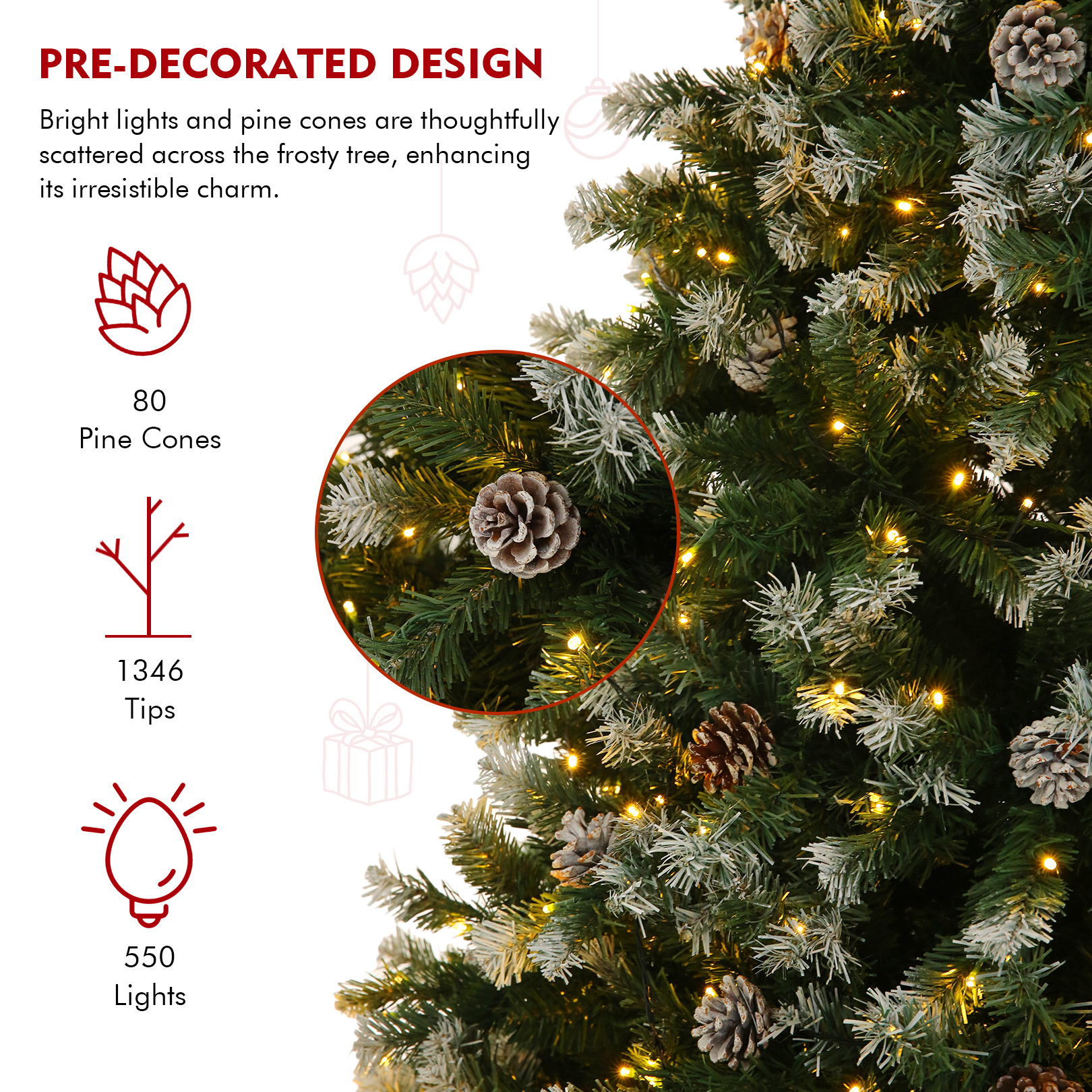 · 【80 Realistic Pine Cones】Thoughtfully distributed throughout the branches, 80 authentic-looking pine cones add natural woodland charm to this artificial tree.