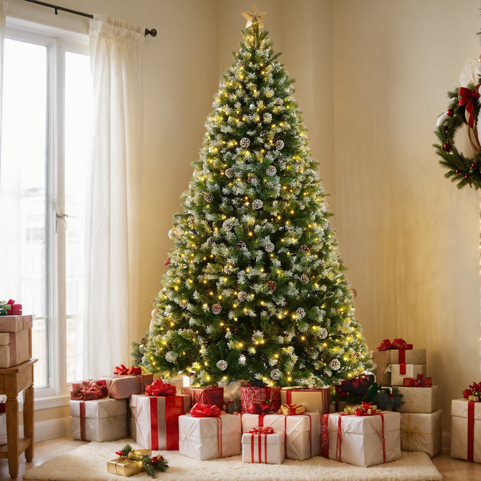 · 【Snow-Sprayed Branch Tips】Each branch tip is delicately coated with artificial snow spray, creating the enchanting illusion of freshly fallen snow. This sophisticated finishing touch transforms the tree into a winter wonderland centerpiece