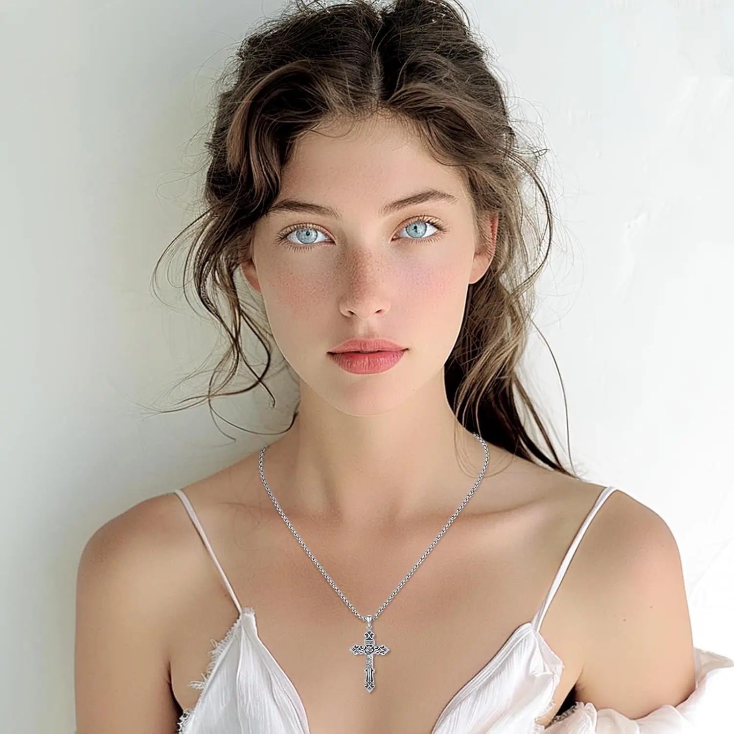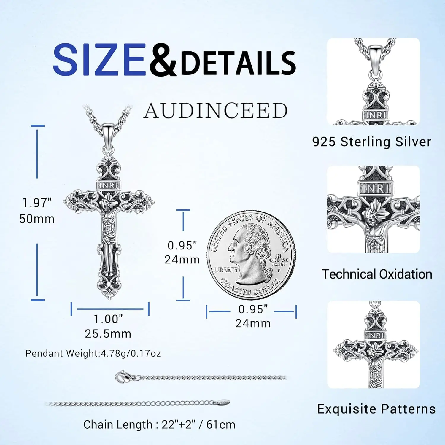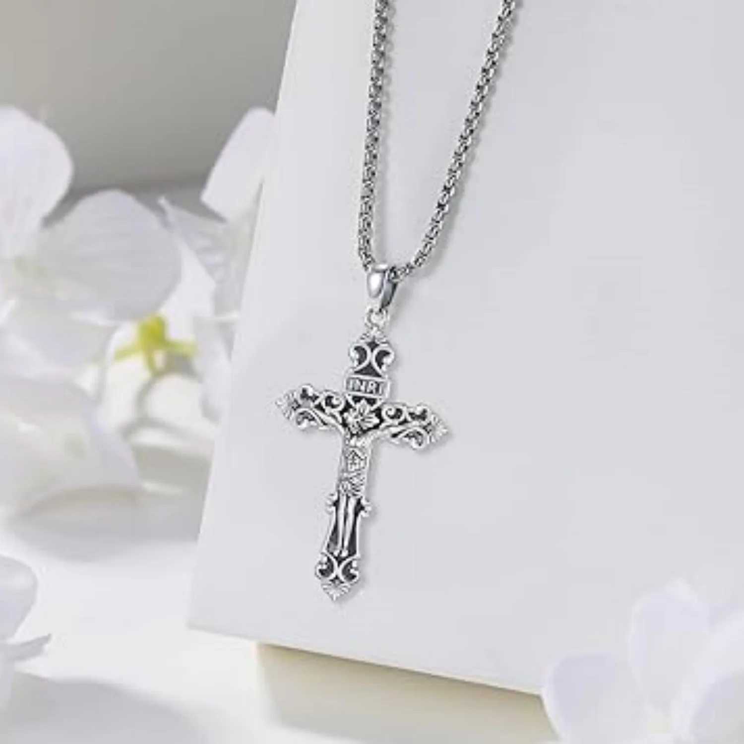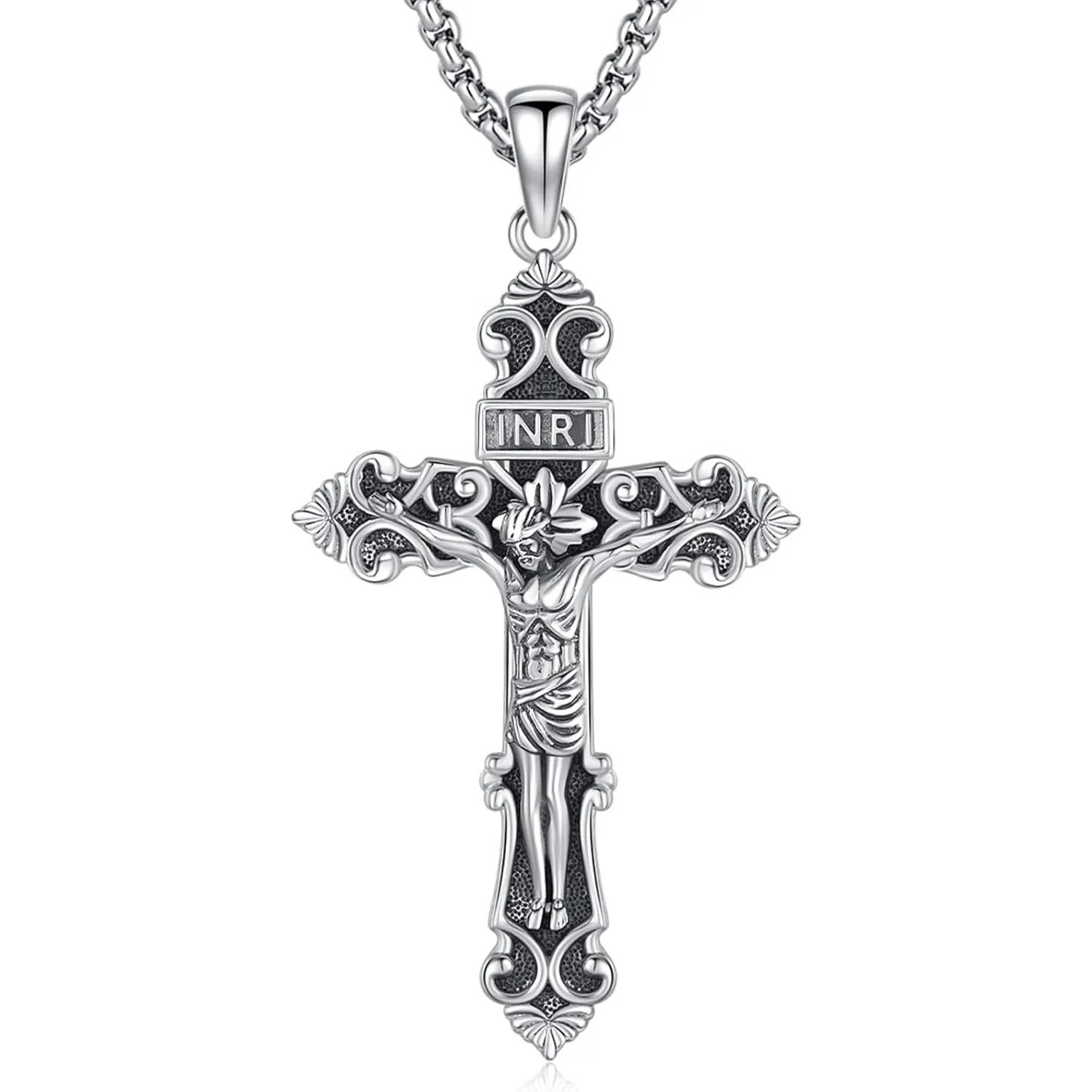 Catholic Cross Necklace: Cross Jesus jewelry is made of 925 sterling silver and add Oxidation process, no nickel, no lead, no cadmium and hypoallergenic. It won't turn your skin green or black