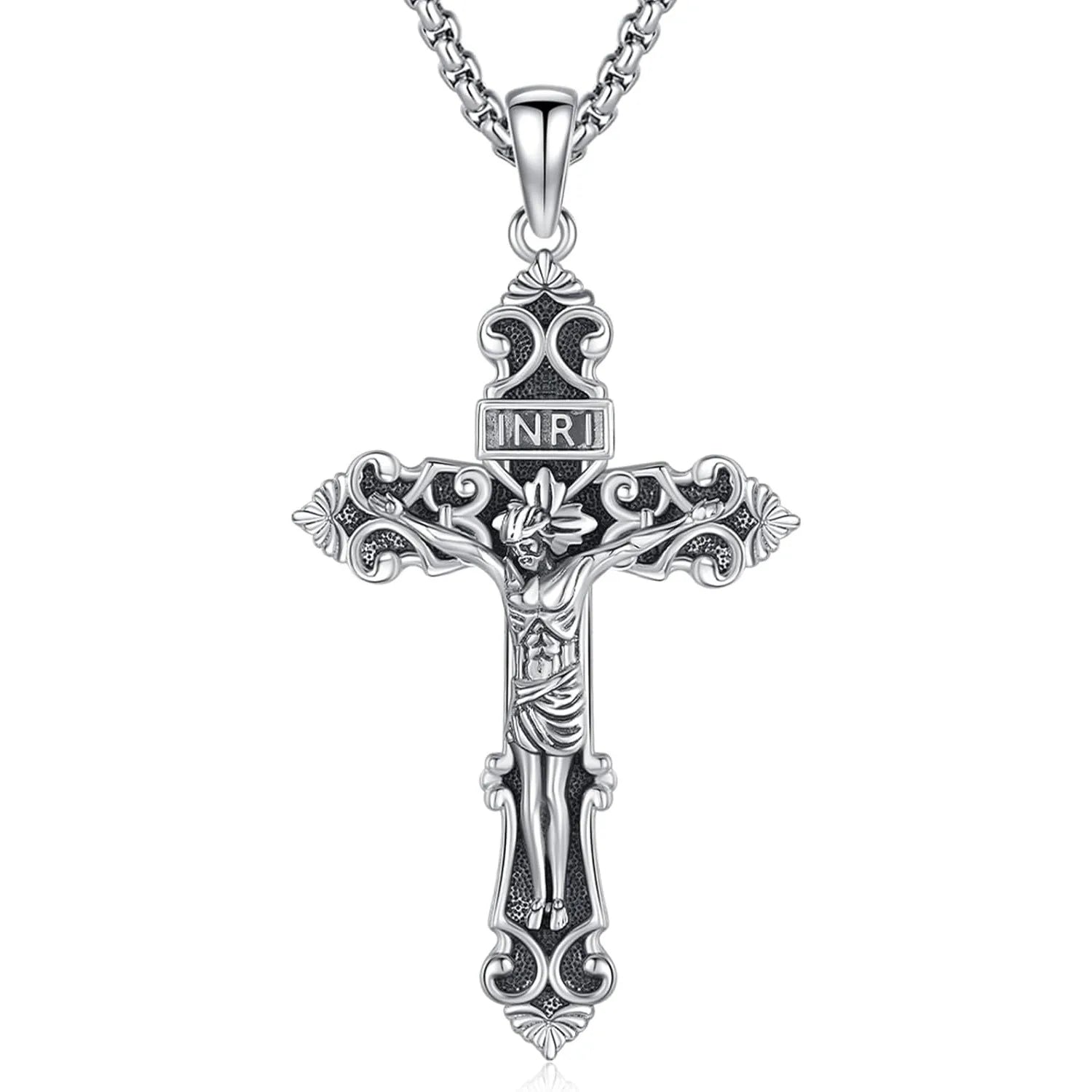 Jesus Cross Necklace: This elegant pendant features Jesus Christ on the holy cross below a banner inscribed with the initialism “INRI”. Use it to demonstrate your faith in Jesus Christ
